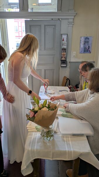 Es war einfach wundervoll! Rund um die St. Nicolaikirche in Gifhorn fanden spontane und angemeldete Trauungen und Segnungen statt. An den fest vereinbarten Terminen kamen junge und ältere Paare, mit und ohne Gäste … es war bunt gemischt. Ebenso bei den offene Zeitslots für spontane Paare. Trotz des Regenwetters waren die Momente, die wir erleben durften, durchweg berührend. Einige Trauungen fanden in der Kirche statt, andere draußen zwischen den Blumen im Kirchgarten unter einem Pavillon.